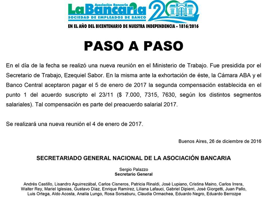 La Bancaria firmó a un acuerdo con el Banco Central y con la Cámara ABA para que éstos paguen la segunda cuota de compensación. Además realizarán una reunión el 4 de enero para seguir discutiendo el acuerdo salarial.