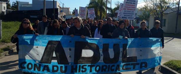 En la primera jornada de la semana de huelga, afiliados de la Asociación de Docentes Universitarios (ADU) ocuparon hoy por varias horas la sede del rectorado de la Universidad de San Luis, en la capital provincial.