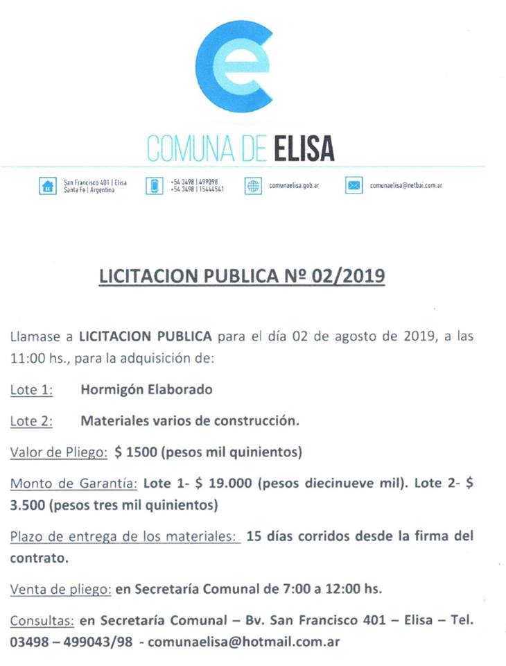 La comuna de Elisa publicó el llamado a licitación pública Nro. 02/2019 para la adquisición de Hormigón Elaborado, para el día 02 de agosto.