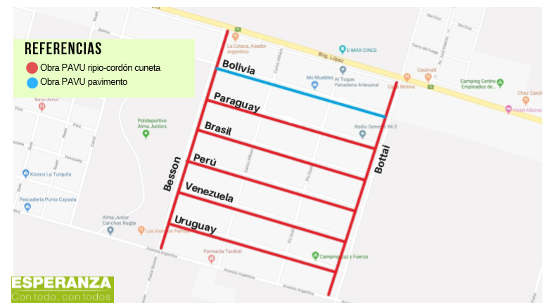 Ripio con cordón cuneta de hormigón en: Paraguay, entre Besson y Bottai (3 cuadras) * Brasil, entre Besson y Bottai (3 cuadras) * Perú, entre Besson y Bottai (3 cuadras) * Venezuela, entre Besson y Bottai (3 cuadras) * Uruguay, entre Besson y Bottai (3 cuadras) * Besson, entre Brigadier López y Avda. Argentina (7 cuadras) * Bottai, entre Brigadier López y Avda. Argentina (7 cuadras)