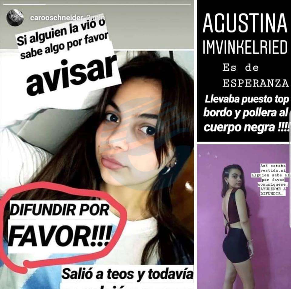 A través de redes sociales comenzaron a circular fotos suyas emitidas por familiares y amigas y se ruega que cualquier dato que se pueda aportar se haga de urgencia para poder dar con la joven Agustina Imvinkelried.