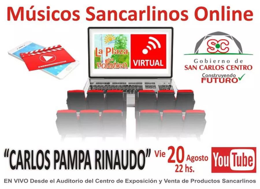 Este viernes 20 de agosto, Músicos Sancarlinos on Line con el Show en Vivo de Carlos “Pampa” Rinaudo, “Tango y Algo Más”, espectáculo que será transmitido, a partir de las 22:00 hs., desde el Auditorio del Centro de Exposición y Venta de Productos Sancarlinos a través del Canal de YouTube del “Gobierno de San Carlos Centro”, de la Fan Page “La Plaza del Domingo Ciudad” y de FM San Carlos 107.7.
