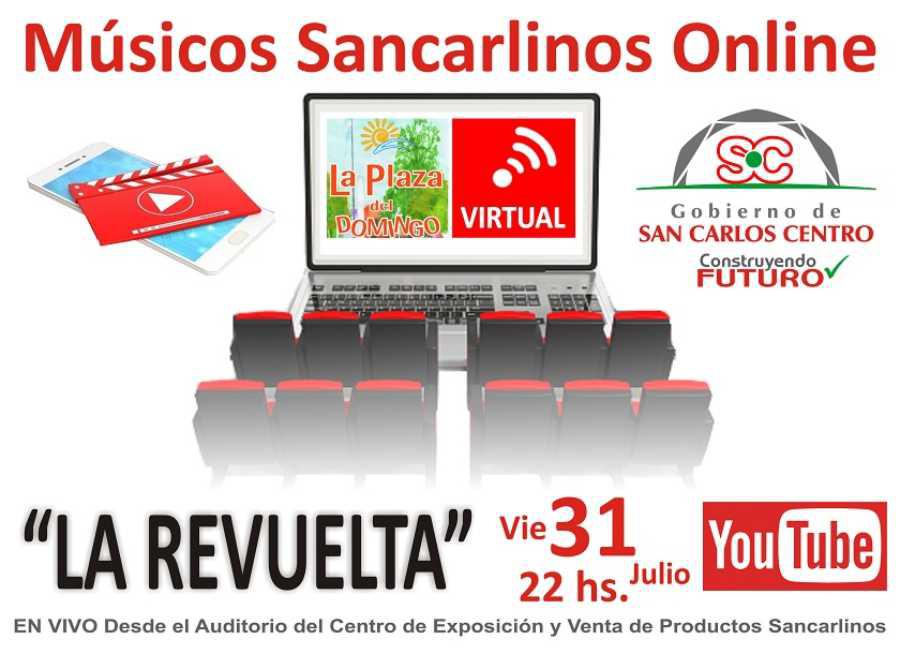 Este viernes 31 de julio, músicos sancarlinos on line con el Show en Vivo de “La Revuelta”, espectáculo que será transmitido, a partir de las 22:00 hs., desde el Auditorio del Centro de Exposición y Venta de Productos Sancarlinos a través del Canal de YouTube del ¨Gobierno de San Carlos Centro¨, de la Fan Page ¨La Plaza del Domingo Ciudad¨ y de FM San Carlos 107.7.