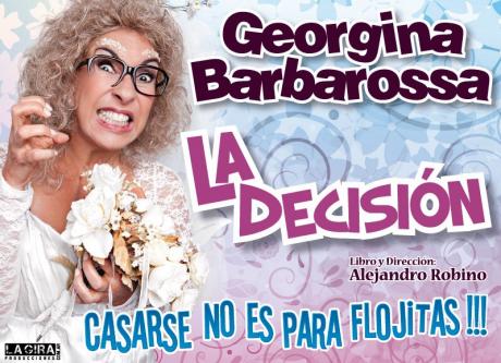 Con Georgina Barbarossa, esmerándose en la interpretación del drama de esta heroína, que injustamente provoca risas y más risas. Escrita y dirigida, en clave de humor, por Alejandro Robino, un soltero empedernido que muy lejos está de poder comprender la seriedad del acontecimiento. “La decisión”. Porque casarse, no es para flojitas.