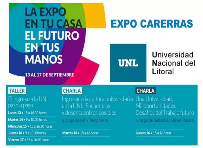 El gobierno de San Carlos Centro, a través del Campus Universitario Municipal, informa que la Universidad Nacional del Litoral realizará una nueva edición de la tradicional Expo Carreras bajo la consigna “La Expo en tu casa, el futuro en tus manos”. La misma se desarrollará desde el Lunes 13 al viernes 17 de septiembre de manera virtual, con el siguiente programa de actividades: