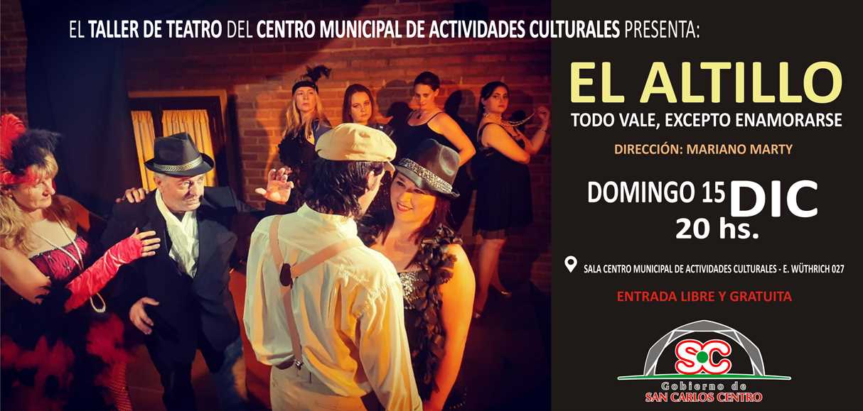 El Gobierno de San Carlos Centro invita a presenciar la puesta en escena de “EL ALTILLO”, obra íntegramente producida por el Taller de Teatro que se desarrolla en el Centro Municipal de Actividades Culturales bajo la dirección del Profesor Mariano Marty, con la participación de jóvenes y adultos amantes de esta expresión cultural que se mantiene firme en el espacio municipal desde hace muchos años.