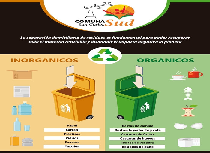 La Comuna de San Carlos Sud informa que a partir del próximo Lunes 18 del corriente, la Licenciada en Saneamiento Ambiental Verónica Zeiter va a estar visitando los diferentes domicilios de la localidad, para informar a la población sobre la importancia en la separación de los residuos domiciliarios y la manera correcta en que debe realizarse.