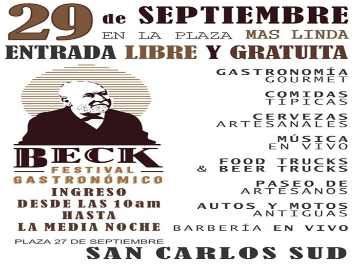 Con motivo de cumplirse hoy, 27 de septiembre los 161 años de la Colonia San Carlos, desde la Comuna de San Carlos Sud emprendieron la organización del “Beck, festival gastronómico”, como parte de los festejos populares que todos los años se llevan a cabo, pero que en ésta ocasión tiene atractivos diferentes a los habituales.