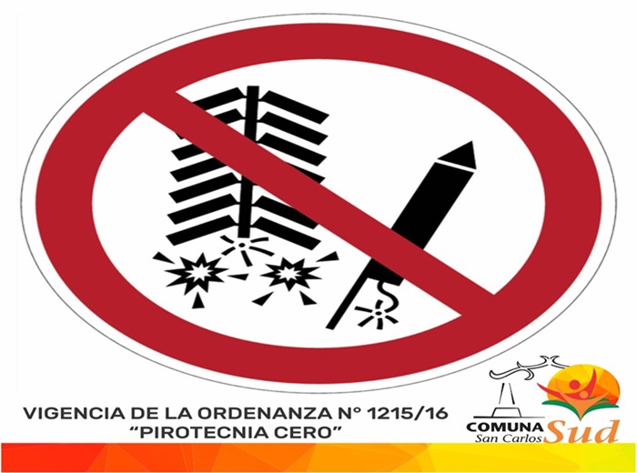 La Comuna de San Carlos Sud informa que se encuentra en plena vigencia la Ordenanza N° 1215 sancionada el 01/11/16 denominada “Pirotecnia Cero”, prohibiendo la tenencia, acopio, depósito, exhibición, manipulación, uso, venta o cualquier otra modalidad de comercialización, tanto mayorista como minorista sea entre personas físicas y/o jurídicas de elementos de pirotecnia.