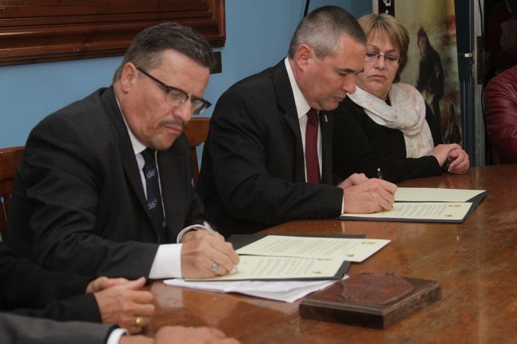 Luego de la ceremonia religiosa la delegación llegó hasta la sede comunal, donde en el Salón Celeste se firmaron las actas oficiales del hermanamiento.