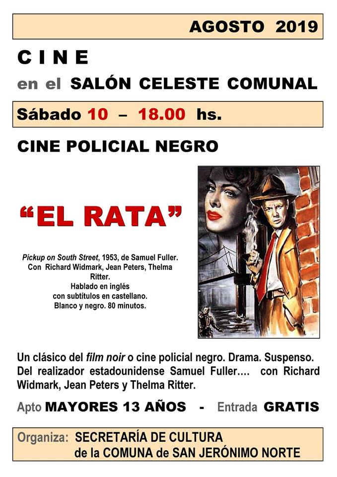 Se exhibirá el film estadounidense «EL RATA» (Pickup on South Street, 1953, del realizador Samuel Fuller. Con Richard Widmark, Jean Peters y Thelma Ritter. Hablado en inglés con subtítulos en castellano. Blanco y negro. 80 minutos). Intenso film noir o cine policial negro… uno de los más destacados en su género.