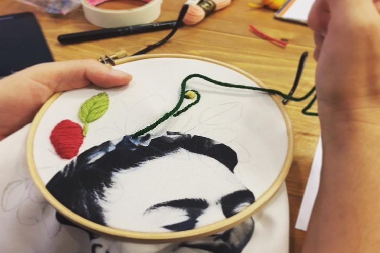 En colores vibrantes propone bordado en bastidor, sobre una tela con un diseño o dibujo, con lanas y agujas y apuntes.