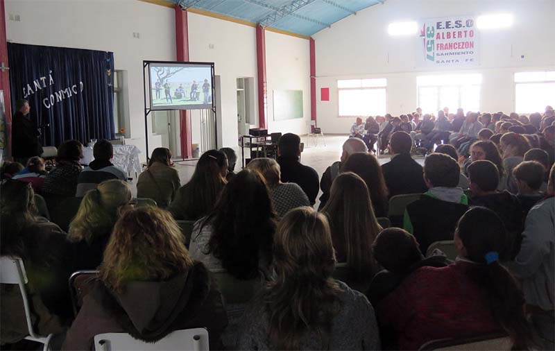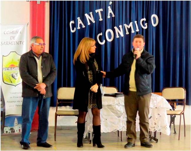 Este lunes alumnos de  la Escuela Secundaria N° 357 y de la Escuela Primaria N° 343, junto a sus docentes y directivos, así como también púbico en general y miembros de Instituciones locales se dieron cita en la localidad de Sarmiento para presenciar Documental “Canta Conmigo”, en el que participó el compositor sanmiertino Gonzalo Benítez, con su obra “Te sigo buscando”.