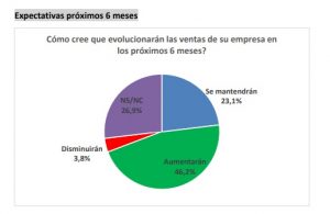 Sobre las expectativas de ventas para los próximos seis meses, desde el sector «vemos que un 46,2% cree que aumentarán, un 23,1% se mantendrán, un 3,8% disminuirán y un 26,9% prefiere no emitir opinión».
