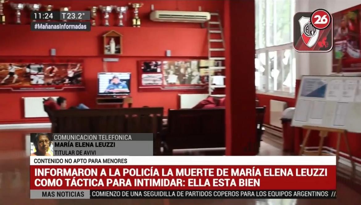María Elena Leuzzi, titular de la asociación Ayuda a las Víctimas de Violación (Avivi), entidad que denunció supuestos abusos a jugadores de las divisiones inferiores de River, aseguró que la policía ingresó a su casa en la madrugada de hoy por un falso llamado al 911, en el que decían que estaba muerta.