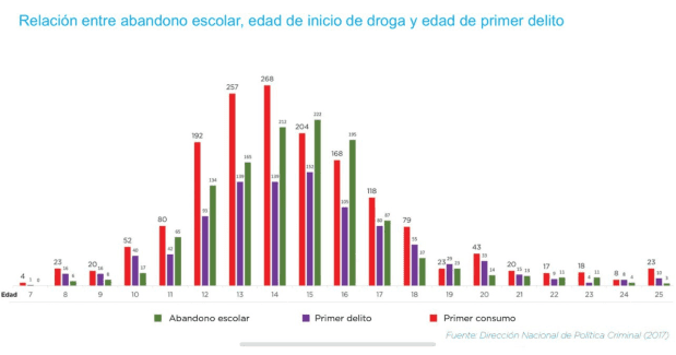Según datos de la Dirección Nacional de Política Criminal, el 55% de las personas que cometieron delitos en el año 2017, afirmaron haber usado armas en el ataque, y el 67% aseguró haber comenzado con el consumo de drogas entre los 7 y 13 años.