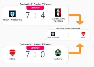 En primer lugar, el último campeón Argentino de Franck derrotó 7-4 a Estrellas de Talleres de Laguna Paiva, metiéndose así en unas nuevas semifinales, recordando que este equipo ha ganado hasta el momento todos los campeonatos desarrollados por la Asociación Esperancina a nivel zonal.