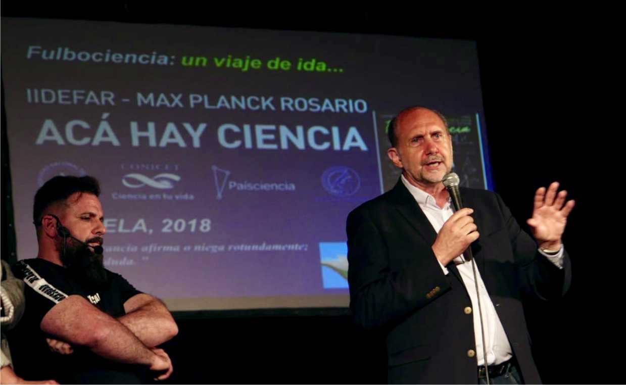 El senador nacional destacó la figura del Dr. Claudio Fernández -Director del Instituto IIDEFAR Max Planck Rosario, creador de la Plataforma País Ciencia y principal orador de la conferencia- quien «optó por volver para hacer ciencia en la Argentina» y por ello «nos parece muy valioso que comparta hoy con nosotros su mirada, que acerque la ciencia, que la federalice, que la lleve a cada rincón de la Argentina y en particular de nuestra provincia, que la haga más cercana y que les sirva fundamentalmente a ustedes los jóvenes».