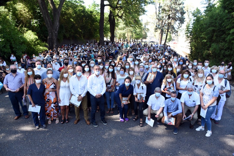 El intendente Pablo Javkin y el secretario de Salud Pública Leonardo Caruana encabezaron en la mañana de este miércoles un acto de reconocimiento a trabajadoras y trabajadores de la Salud Pública y sus dispositivos de cuidados de Covid-19, que tuvo lugar en El Jardín de los Niños (avenida Lugones 2290).