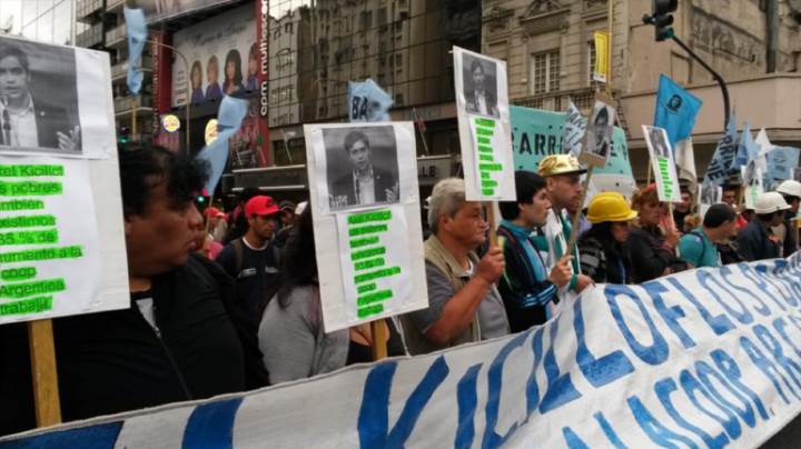 Miembros de la organización social Barrios de Pie bloqueaban esta mañana el tránsito en el centro porteño, en reclamo de un aumento de 35 por ciento para los beneficiarios de programas sociales, empleados de cooperativas y trabajadores precarizados.