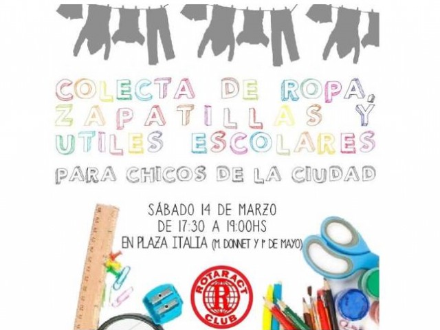 El Rotaract Club Esperanza organiza una colecta de útiles escolares y calzados para muchos chicos de la ciudad que ya comenzaron las clases y no cuentan con elementos mínimos para asistir. Será este sábado 14 de marzo de 17 a 19:30 en la Plaza Italia ubicada en 1º de Mayo y Maestro Donnet. Es otra de las actividades que organiza la agrupación de jóvenes en coincidencia con la Semana Mundial de Clubes Rotaract.