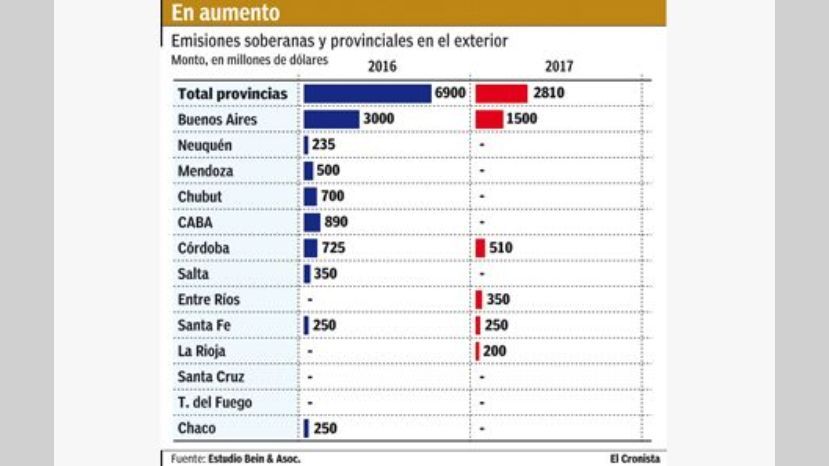 Las provincias emitieron deuda en lo que va del gobierno de Mauricio Macri por u$s 9710 millones en los mercados internacionales. A este total se suman las colocaciones que se espera se concreten en las próximas semanas. Sólo en lo que va de 2017, fueron cinco las que ya salieron a fondearse en el mercado y lo hicieron por u$s 2810 millones.