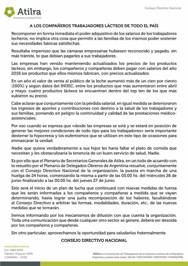 El sindicato Atilra, que agrupa a la mayoría de los obreros lácteos del país, emitió un comunicado donde reclama “recomponer en forma inmediata el poder adquisitivo de los salarios”. En tal sentido, el Plenario de Secretarios Generales reunido en Sunchales resolvió el inicio de un plan de lucha llamando a sus bases a paralizar las industrias lácteas durante la jornada del miércoles 26 de junio.