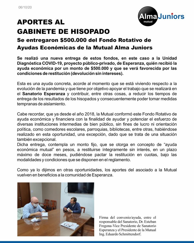 A través de un convenio/ayuda, se realizó una nueva entrega del Fondo Rotativo creado por la Mutual, a la Unidad Diagnóstica COVID-19, proyecto público-privado, de Esperanza, por un valor de $500.000 (con devolución sin intereses), a fin de apoyar el trabajo que se realizará en el Sanatorio Esperanza y así contribuir a reducir los tiempos de entrega de los resultados de los hisopados.