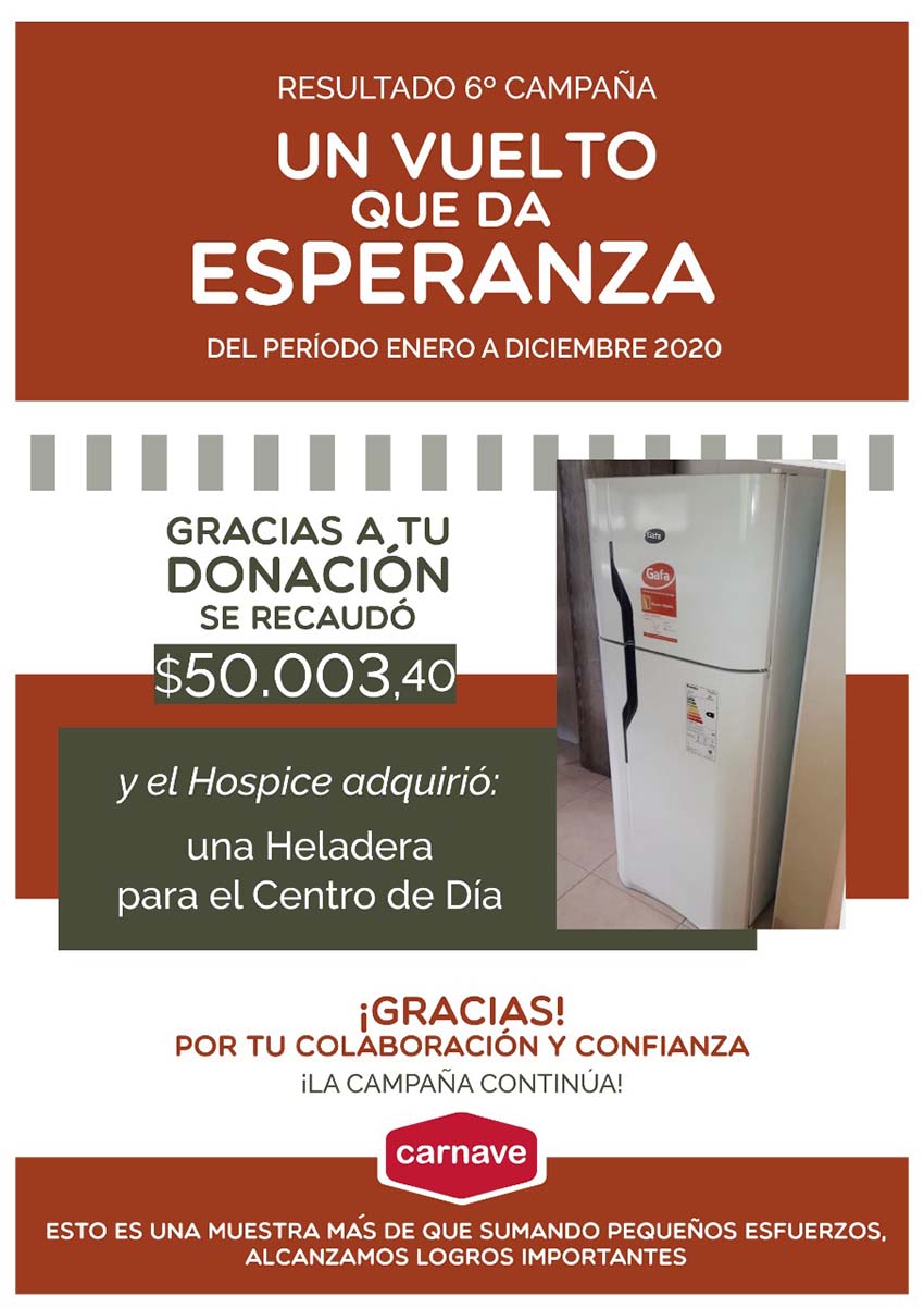 Esta Campaña fue comprendida entre enero y diciembre del 2020 y se recaudaron $50.003,40 con los cuales el Hospice decidió adquirir una heladera para el Centro de día.