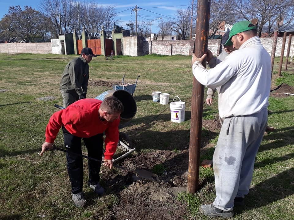 Su comisión directiva y sus colaboradores vienen trabajando en realizar tareas de acondicionamiento de sectores de ingreso, paredes, salones y ahora también en el sector de la parcialidad visitante donde colocaron los postes para instalar un nuevo tejido.