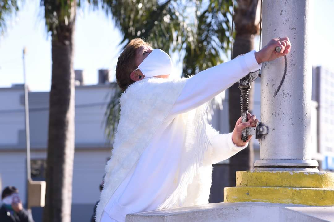 Así fue como en este día especial y ante los tiempos difíciles que atravesamos, Beatriz «Pecha» Galván de Suárez enfermera de nuestro hospital José Vionnet y en representación de todo el personal de salud, izó la enseña Patria para que baile en el cielo argentino.