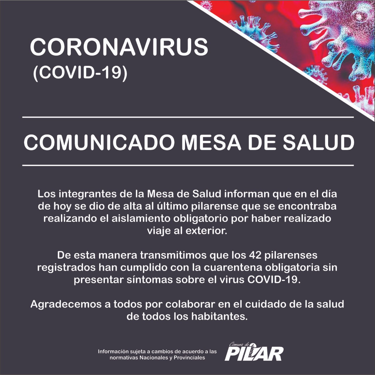 La mesa de salud de la localidad de Pilar, informa a la población que se procedió a dar de alta al último paciente que mantenía Cuarentena Obligatorios en su domicilio por haber viajado al exterior. Con ello ya no quedan pilarenses en aislamiento obligatorio.