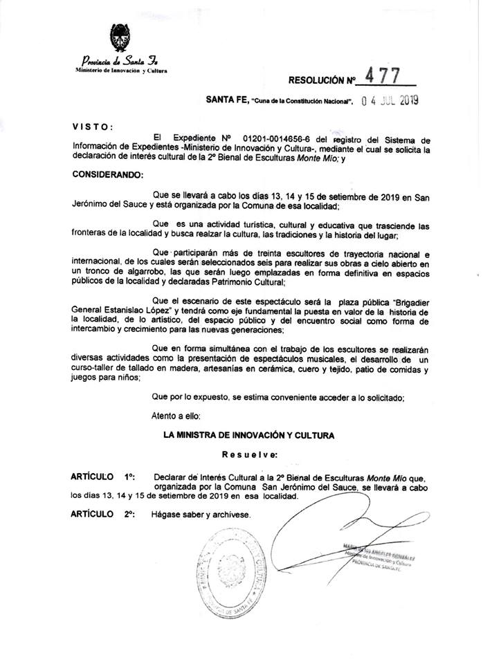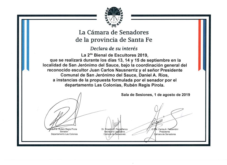El Ministerio de Innovación y Cultura de la Pcia. de Santa Fe ha declarado de Interés Cultural a la 2° Bienal de Escultores de San Jerónimo del Sauce.