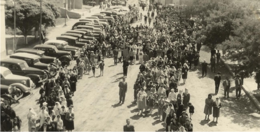 Como es tradición, el Patrono en su día, procesiona alrededor de la plaza sobre los hombros de los descendientes de familias fundadoras, vestidos con sus clásicas capas rojas y túnicas blancas. Por delante se arrojan pétalos de flores perfumando el paso del Santo, y el estruendo de bombas marcan cada estación.