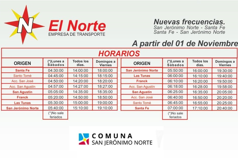 A continuación, la comuna de la localidad comparte la planilla con los horarios de la nueva línea de colectivo “El Norte” que comienzan regir a partir del 1 de noviembre del corriente año.