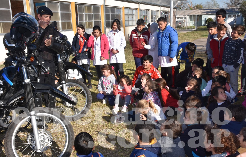 En este caso, los integrantes de Infantería, Sección Perros y Brigada Motorizada se trasladaron con todo su equipamiento hasta la Escuela 1352 «Dr. René Favaloro» ubicada en barrio Los Troncos para que los alumnos de la primaria y del Jardín de Infantes N° 316 observen y aprendan como se llevan a cabo los distintos procedimientos en cada situación de emergencia.