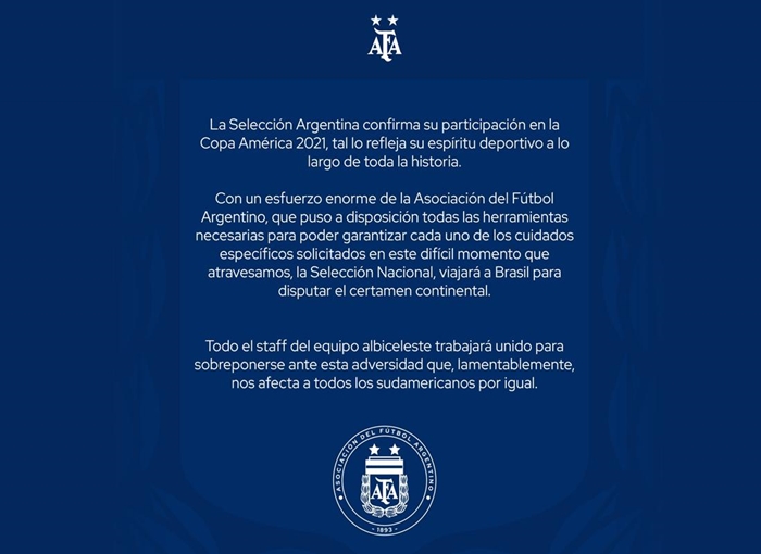 Mientras avanza la segunda ola de coronavirus por la Argentina y por toda Sudamérica y Brasil, la AFA informó que la Selección Nacional disputara el torneo continental tal como estaba estipulado. «Con un esfuerzo enorme de la Asociación del Fútbol Argentino, que puso a su disposición todas las herramientas necesarias para poder garantizar cada uno de los cuidados específicos en este difícil momento que atravesamos», reza parte del anuncio.