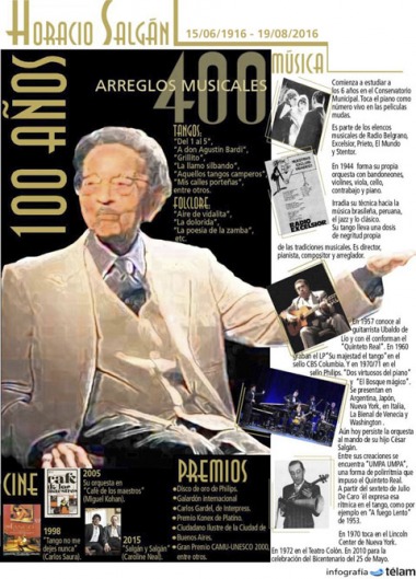 Horacio Salgán, uno de los músicos argentinos que despertó mayor admiración en el mundo, falleció a los cien años en el Sanatorio Güemes de la Capital Federal en un año cargado de homenajes a su figura, acaso por ser quien desarrolló el lenguaje del tango hasta alcanzar su expresión estética más depurada.