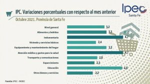 El Instituto Provincial de Estadística y Censos de la provincia de Santa Fe publicó el Índice de Precios al Consumidor correspondiente a octubre de 2021, registrando una inflación del 3,2%. Los indicadores incluidos son: Alimentos y Bebidas; Indumentaria; Vivienda y servicios; Hogar; Salud; Transporte y Comunicaciones; Esparcimiento y Educación; y otros bienes.