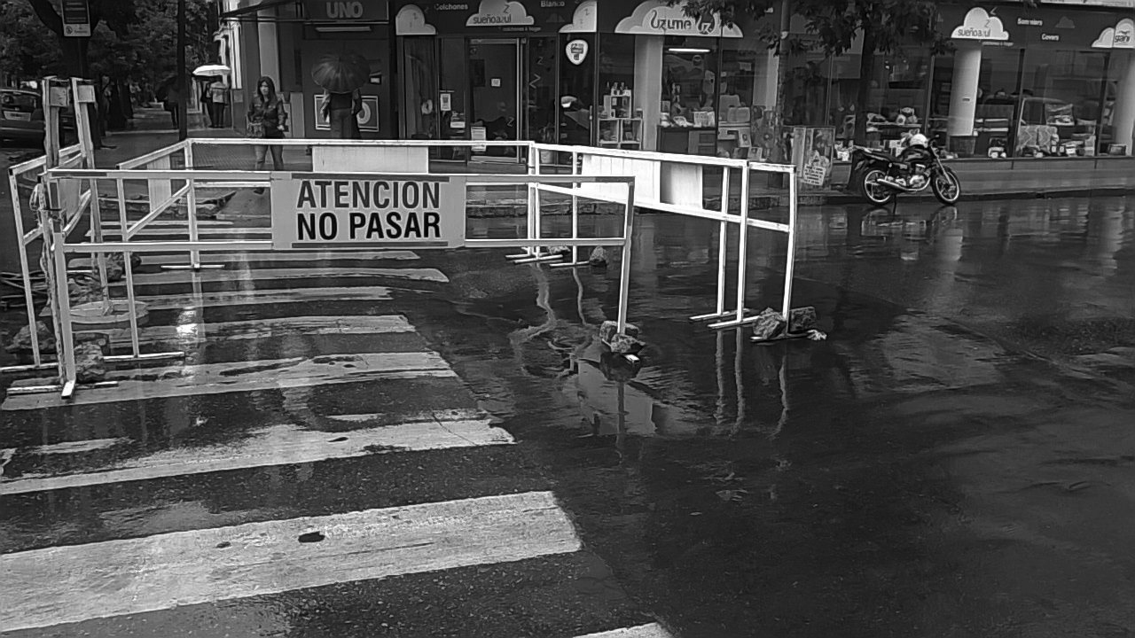 Otro caso, se registró en Gdor. Crespo y Pje. Paraguay. Allí no hay un bache ni un hundimiento, si no un considerable pozo. Esto es: rotura del asfalto de un diámetro y profundidad de importancia. El “accidente topográfico” en cuestión, también está delimitado por un vallado o corralito de la empresa de aguas de la provincia.