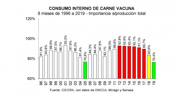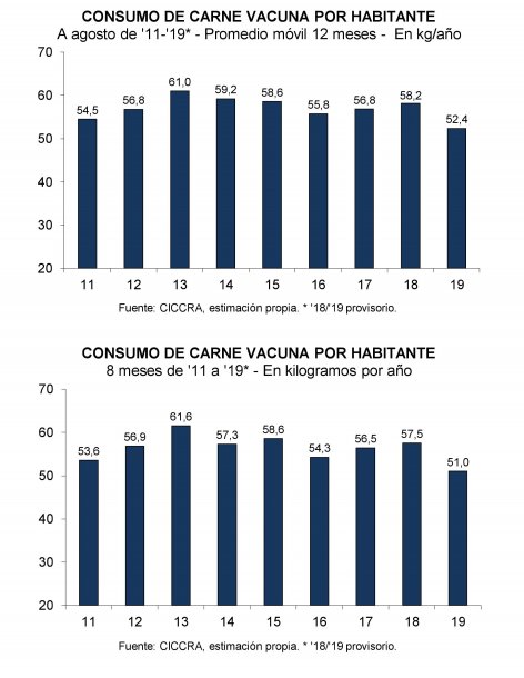 «El número de cabezas faenadas aumentó, pero disminuyó el peso promedio (-3,7% anual) y al mercado interno se entregaron 1.529 millones de tn r/c/h en enero-agosto de 2019, con una baja de 10,4% anual. Esto representaría 76,4% del total producido, cuando en igual período de 2018 había representado 83,6% del total», sostuvieron.